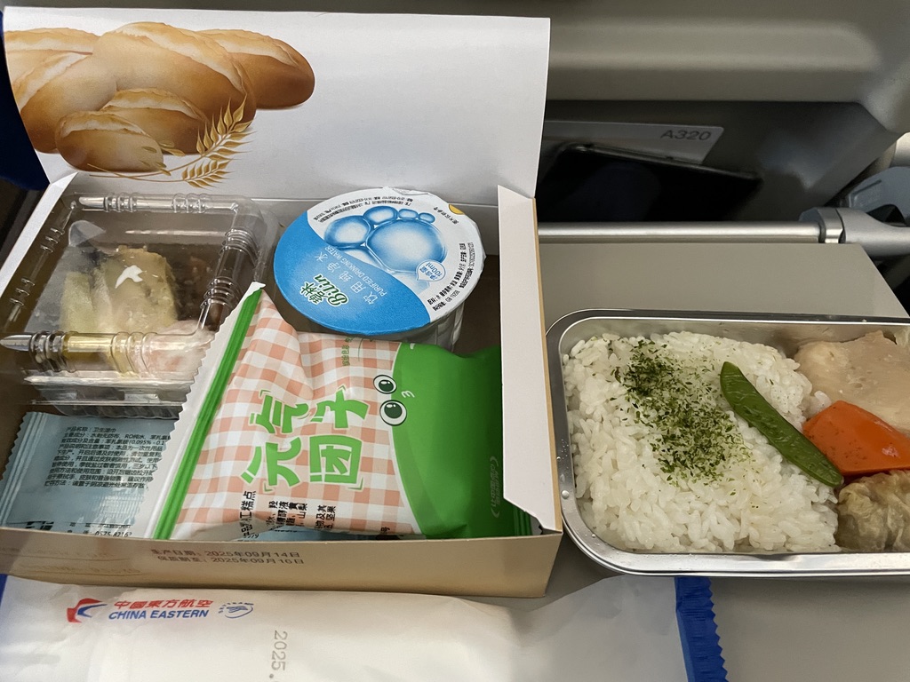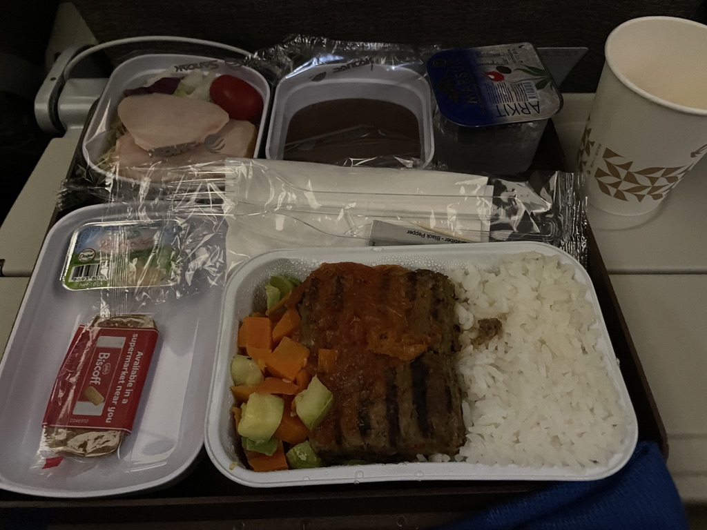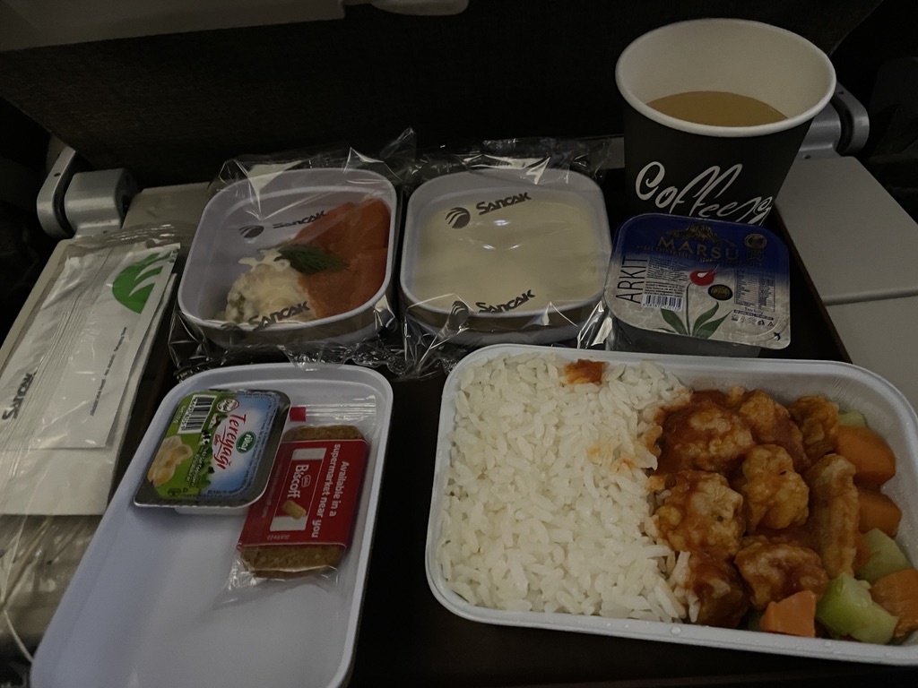 夜ご飯を食べ、そして早朝にまたご飯を食べます。(ロングフライトです)